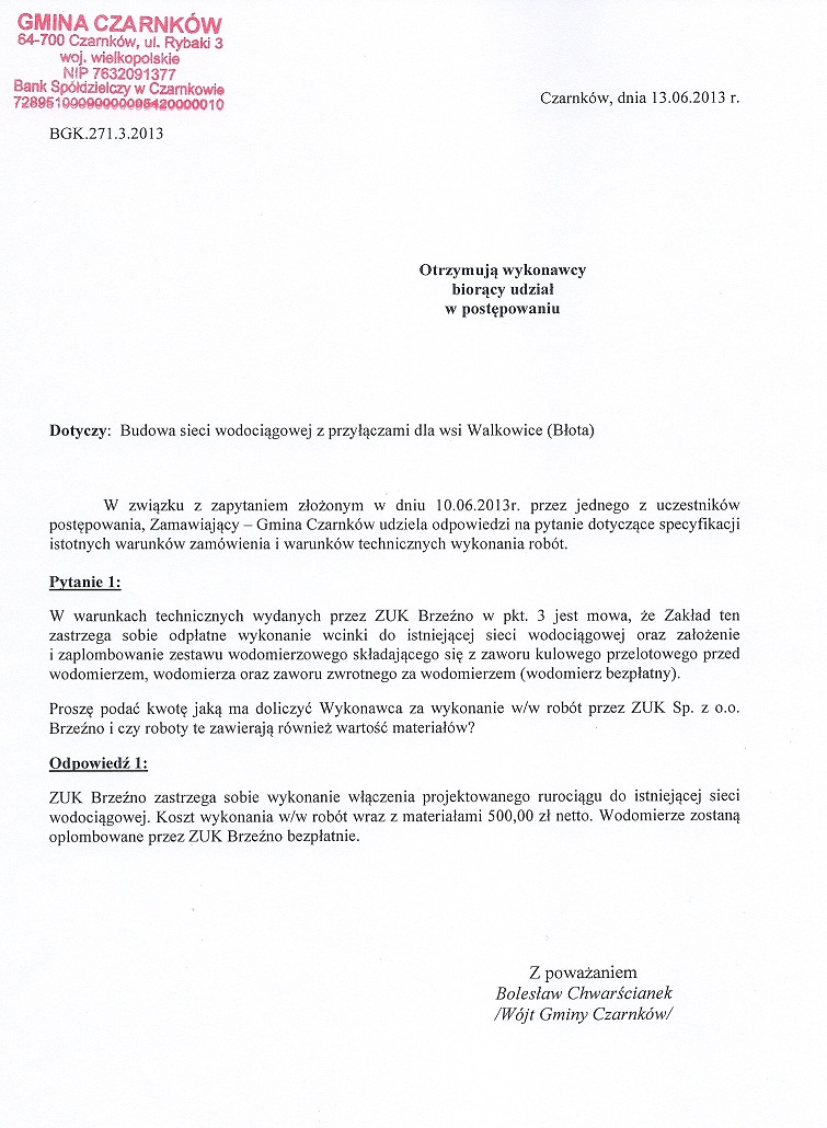 Odpowiedzi na zapytania - Przetarg na budowę sieci wodociągowej z przyłączami dla wsi Walkowice (Błota)