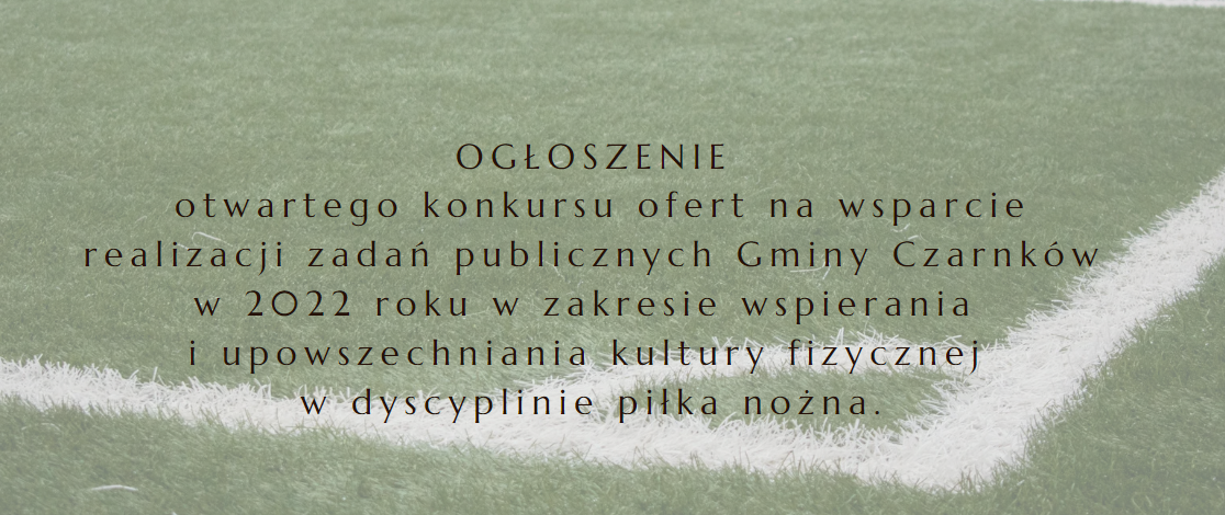 Działając na podstawie art. 15 ust. 2h ustawy z dnia 24 kwietnia 2003 r. o działalności pożytku publicznego i o wolontariacie (tj. Dz. U. z 2020 r. poz. 1057 z późn. zm.) o g ł a s z a m, że rozstrzygnięto otwarty konkurs ofert na wsparcie realizacji zadań publicznych Gminy Czarnków w 2022 roku w zakresie wspierania i upowszechniania kultury fizycznej w dyscyplinie piłka nożna.