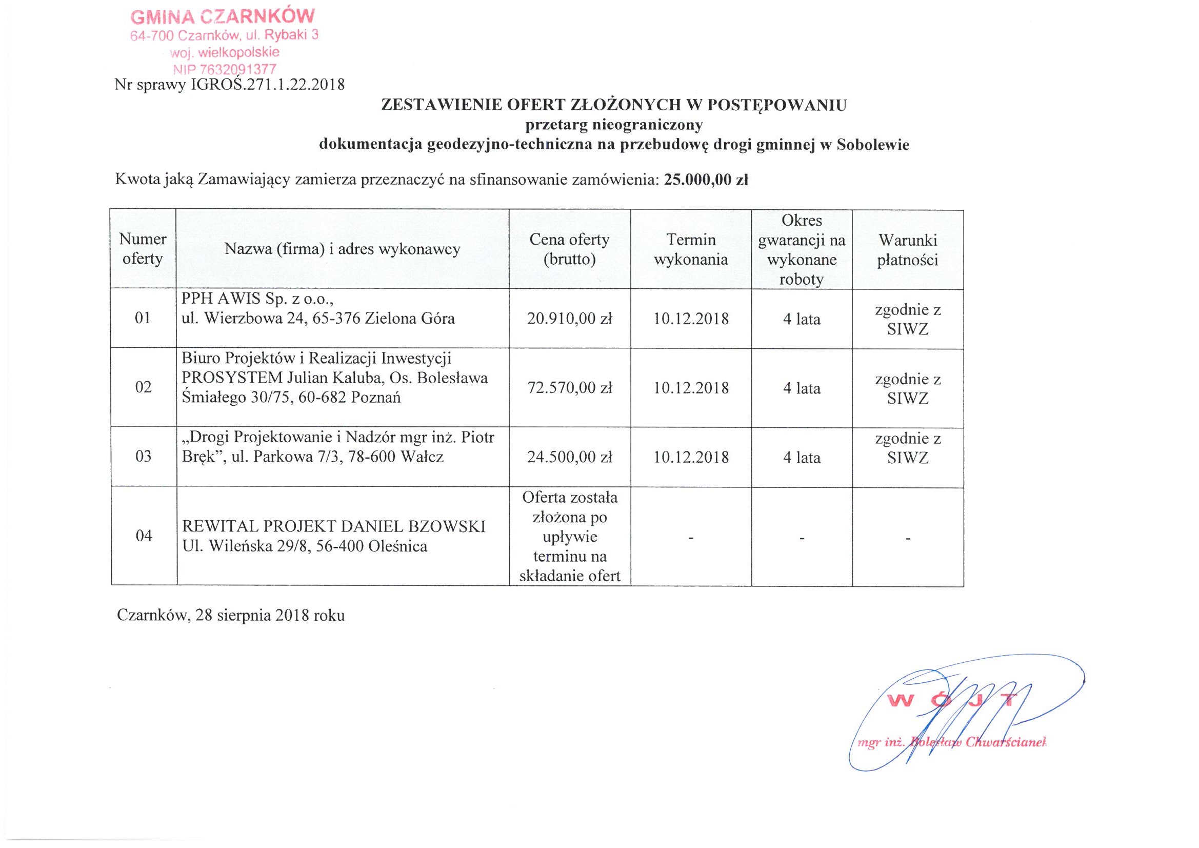 Zestawienie ofert złożonych w postępowaniu na wykonanie dokumentacji geodezyjno-technicznej na przebudowę drogi gminnej w Sobolewie